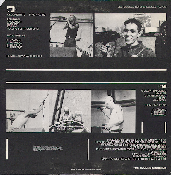 ℗ 1983 Les Disques Du Crepuscule Published by Les Bruits Essentiels Made in Italy by Base Record Bologna Produced by [... 2/3.11.82. Recorded at Dartington College of Music 22/23.10.82. Many thanks Richard Heslop and Susan Sharrot. Contrary to the original release there is no locked groove on Side A which was the reason of the total playing time infinite symbol. Total Time [Side A: ∞ Total Time [Side B: 23:00 From back cover: "23 Skidoo will not be liable for any injury, loss or damage, direct or consequential, arising out of the use of, or inability to use this product."