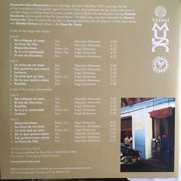 180g High Quality Pressing! Pressed at Pallas in Germany! Re-mastering by Ray Staff at Air Mastering! La Casa de Trova. The house of the troubadours. It's a place of almost mythical status in Cuban music, the home of so many of the glorious songs that have come out of the island. Even Paul McCartney has made his pilgrimage there. For Alejandro Almenares, it's a place he visits every single day, still carrying his guitar as he goes to play and talk with friends. And it's the inspiration behind his album Casa De Trova (Tumi Records release: February 25, 2014). For Almenares, the connection to the house is deep. His musician father, Angel Sanchez Almenares, was one of the founders of the Casa. "I was there when it all began, too," he recalls. "I grew up listening to them playing there, the trovas and soneros. I'm 76 now. I'm the last of the founders still alive." It's a house filled with memories of all the tunes that have filled the air over the years - and still do. As a child, Almenares took them all in as naturally as breathing. When he was 10 years old he began attending music school staying until he was 14, "when I had to quit in order to work and help my parents." Two years later he was a professional musician, playing the music his father had written and performed in groups like Los Taínos, Trio Oriente and Las Guitarras Internacionales. A lifetime of music, and, he adds with a smile, "so many bands that the number and names escape me now." If you're a fan of the Buena Vista Social Club, this guy's gonna make them seem like a bunch of posers. Composer, vocalist and tres guitarist, Alejandro Almenares delivers the real thing from Cuba here on this set. This double vinyl set contains the same songs (although in different order); the difference is that the first features his rich and full voice, while the second features his material as (mostly) instrumentals. Flutes, percussion, violin, soprano sax, guitars and intermittent vocal choruses accompany Almenares on the gentle and fragrant instrumental takes of "No Critiques Al Nene" and "La Nina Que Yo Ame", while vocalists Tony Rodon, Eva Grinan, Jose Cabrera and Ismael Borges deliver tales of passion on "Mujercita Linda", "A Tu Retrato", "Te Vi Y Te Contemple" and "De Lo Que Quiero Saber" respectively. The simplicity of the old world charms are on abundant display here. No gimmicks, no frills, just earnest notes and, like the best of cooks, letting the simple ingredients do all the work in creating the flavor that makes your mouth water. Essential listening! Features: • 180g Vinyl • Pressed at Pallas in Germany • Double LP • Re-mastering by: Ray Staff at Air Mastering, Lyndhurst Hall, London • Gatefold Jacket