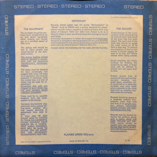 Label note: BIEM | NCB boxed with GEMA printed below. Labels: SPA.33 Sleeve: SPA 33 Hole in main sleeve to show either mono or stereo version. This is a stereo version. Made in England Inner sleeve: R.S. [printed by Robert Stace