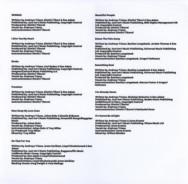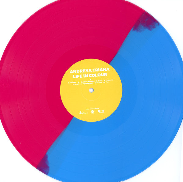 Track A1 title is in capitals: WOMAN Round sticker on shrink wrap reads: Andreya Triana HMV Exclusive Blue & Pink Vinyl (Track durations are not listed on this release. Times from playing the album.)