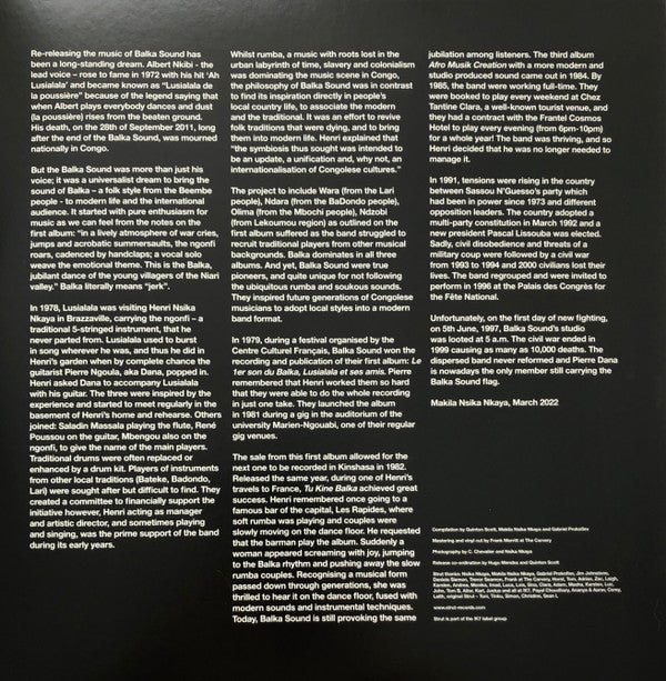 Gatefold sleeve. Tracks A2, A3, B1, B2 and B3 taken from the APIA LP 'Afro Musik Creation' (AP 038). Originally released circa 1983. [r8812063 Tracks C3, D1, D2, D3 and D4 taken from the Le Kiosque D'Orphée LP 'Lusialala et ses amis: le premier son du Balka' (KO / 81.0705) Originally released 1981 [r9787965 Tracks A1, C1 and C2 taken from Le Kiosque D'Orphée LP 'Tu Kine Balka: Collection Sons Et Pas du Balka' (KO 821002) Originally released 1982 [r8307413 Manufactured in Poland. Assembled in Czech Republic.