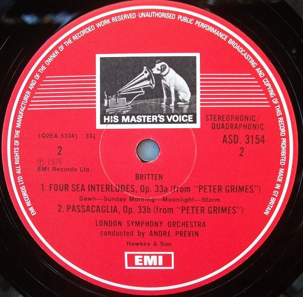 Benjamin Britten - London Symphony Orchestra, André Previn - Four Sea Interludes & Passacaglia From "Peter Grimes" / Sinfonia Da Requiem - LP, Quad - Very Good Plus (VG+)