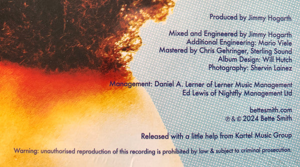 From the rear cover: "Released with a little help from Kartel Music Group" "℗ & © 2024 Bette Smith" Track durations do not appear on this release. Standard jacket
