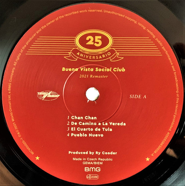 From hype sticker: 25th Anniversary Edition 2CD + 2LP Bookpack Includes: The original album remastered by [... on CD & 2LP CD of previously unheard bonus tracks taken from the original 1996 session tapes (CD #2). 40 page book featuring new liner notes, photos, song notes, lyrics and a history of the original club 2x 12x12" Art Prints Sides A to C and CD1 are 2021 remasters. Side D features bonus tracks and CD 2 previously unreleased bonus tracks. Recorded in just seven days in 1996 at Havana's 1950 vintage EGREM studios. A World Circuit Production ℗ & © 2021 World Circuit Limited, a BMG company. Made in Czech Republic. BMG UK, 8th Floor, 5 Merchant Square, Paddington, London W2 1AS