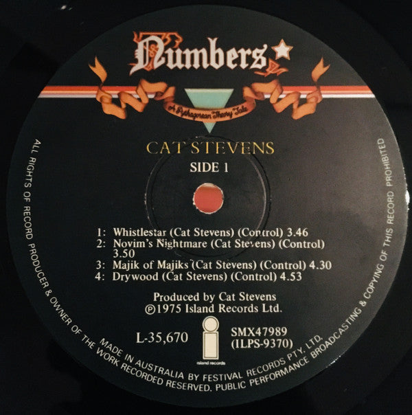 ℗ 1975 Island Records Ltd. Manufactured and distributed by Festival Records Pty. Limited. Australia Trademark owned by Island Records Ltd. London and used by Festival Records Pty Limited under authorization Die-cut front / embossed rear sleeve includes custom inner containing credits and photo (suitable for framing) 16 page booklet contains lyrics and excepts from the book "Numbers" written by Chris Bryant & Allan Scott, based on an original idea by Cat Stevens WARNING: This album is not to be taken 2 seriously