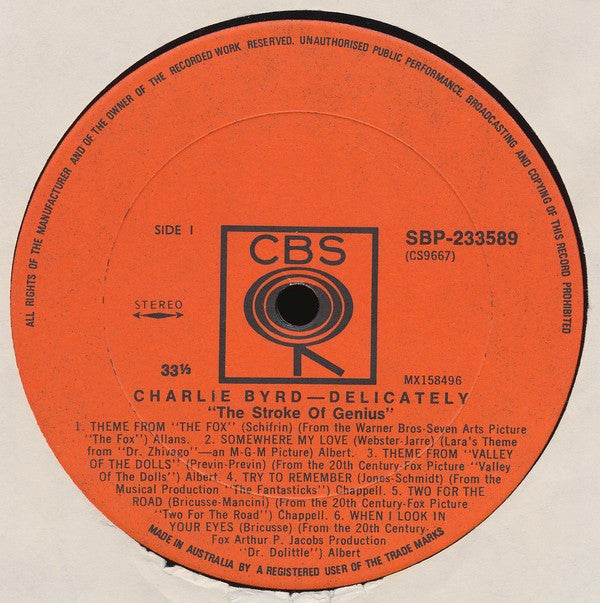 Charlie Byrd - Delicately - LP, Album, RE - Very Good Plus (VG+)