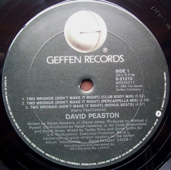 David Peaston - Two Wrongs (Don't Make It Right) - 12", Single - Very Good Plus (VG+)