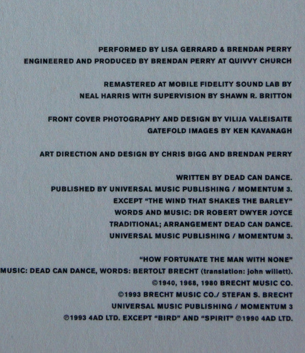 Gatefold sleeve. "How Fortunate The Man With None" ©1940, 1968, 1980 Brecht Music Co. ©1993 Brecht Music Co. / Stefan S. Brecht / Universal Music Publishing / Momentum 3. ℗1993 4AD Ltd. except "Bird" and "Spirit" ℗1990 4AD Ltd. ©2016 4AD Ltd. DAD 3621 Made in EU.