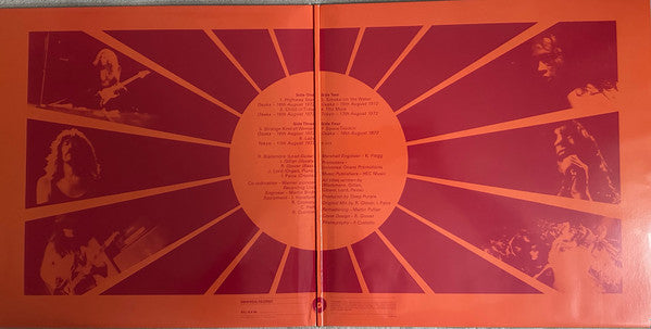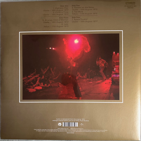 No hype sticker, no download voucher inside. [Back cover: Audio is remastered from the original 1972 analogue stereo master and cut at Abbey Road Studios ℗ & © 2014 The copyright in this sound recording is owned by Deep Purple (Overseas) Ltd. under exclusive license to Universal International Music. All rights reserved. Unauthorised copying, reproduction, hiring, lending, public performance and broadcasting prohibited. Made in the E.U. 0602537696598 Recorded live in Japan A1: Osaka - 16th August 1972 A2: Osaka - 16th August 1972 B1: Osaka - 15th August 1972 B2: Tokyo - 17th August 1972 C1: Osaka - 16th August 1972 C2: Tokyo - 17th August 1972 D: Osaka - 16th August 1972 180 gram vinyl housed in a gatefold jacket with black paper & plastic polylined inner sleeves. Tracks are numbered sequentially on both cover & labels. Runout details: everything is hand etched except the "[MPO Logo® XXXXXXXX" sequence on each side, and "3769659-D 116143E4/A" on side 4, which are stamped. Release date is blank intentionally - no info on the release date of this reissue (2024?). This release is pressed by MPO. For the previous 2014 release pressed by GZ media, see Made In Japan.