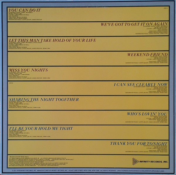 [l315076 pressing denoted by ◈-P-◈ in runouts. Side B metalwork from [l314985 Lenny LeBlanc appears courtesy of Big Tree Records Recorded at Fame Recording Studios, Muscle Shoals, Alabama Mastered at Masterfonics, Nashville, Tennessee ℗ & © 1978 Infinity Records, Inc.