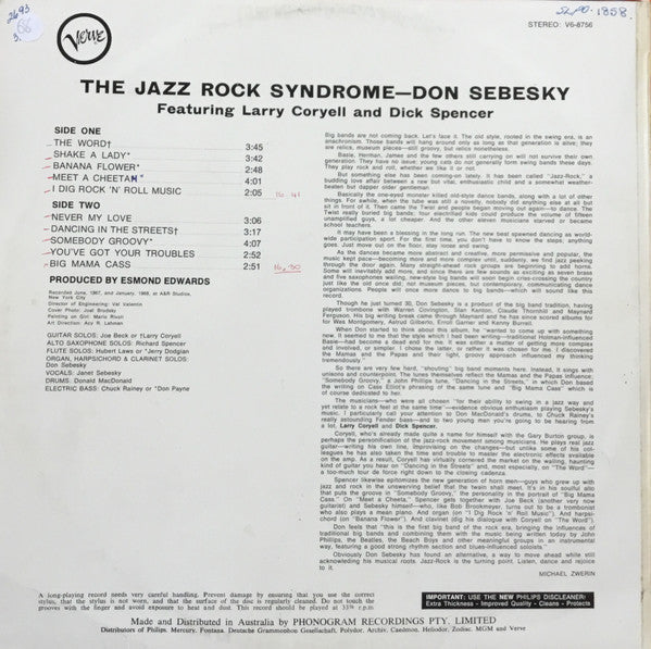 Recorded June, 1967, and January, 1968 Original Australian pressings note they are made and distributed by PHONOGRAM RECORDINGS PTY LIMITED on bottom of rear sleeve.