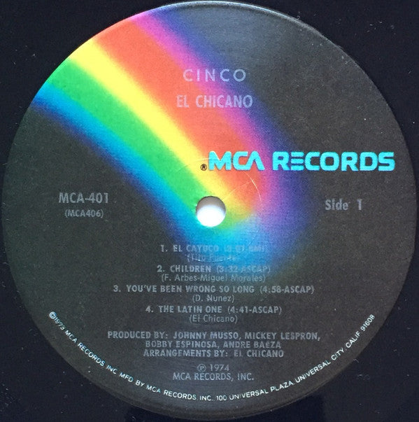 Pinckneyville pressing variant. Recorded at Larrabee Sound Mastering Studio: MCA Recording Studio Special Thanks: Daniel Martel Gonzalo Martinez Margarito Mendoza Carlos Compean Jose G. Gutierrez Aztec Prod. A. E. Sullivan MGR. 2922 Worthen Ave. Los Angeles, California 90039 © 1974 MCA Records, Inc. ℗ 1974 MCA Records, Inc. - Printed in U.S.A. Mfd by MCA Records Inc. Publishing: A1 - Peer International Corp. - BMI A2 - Sunbury Music Inc. - ASCAP A3 - Jowag Music - ASCAP A4 - MCA Music / El Chicano Music ASCAP B1 - Stein & Van Stock Inc. - ASCAP B2 - Fania Pub. Co., Inc. - BMI B3 - Big Kitty Music - ASCAP B4 - Hubtones Music Co. - BMI