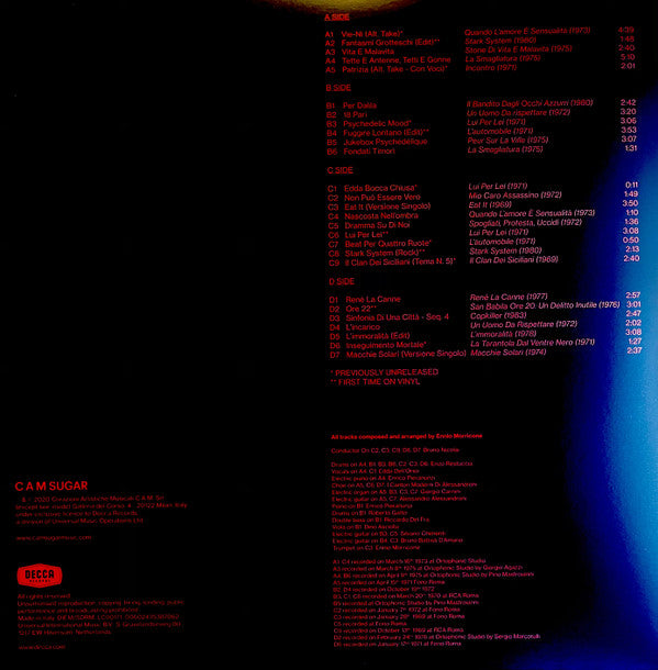 The hidden, dark-tingled and psychedelic side of the Maestro. Featuring previously unreleased tracks. Double LP Gatefold & 7" Single on transparent yellow vinyl. Exclusive Poster. Collector's Edition. Bonus 7" is one sided and comes in plain white cover - it contains a montage of studio chat, cues and joking featuring Morricone & musicians, Edda dell'Orso and studio crew.
