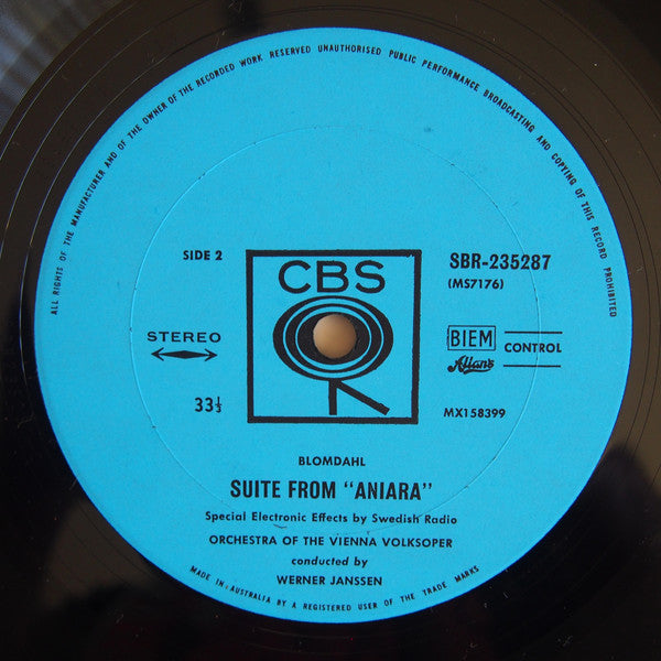——Sleeve info—— Front reads: Ormandy - Philadelphia Orchestra - Bernstein - New York Philharmonic - Perform Selections From - 2001 - A Space Odyssey - With The Gregg Smith Singers - Added Electronic Effects By Morton Subotnik Music From Blomdahl's Opera - Anaria - An Epic Of Space Flight In 2038 A.D. - Electronic And Concrete Effects By Swedish Radio Spine: 2001: A Space Odyssey Eugene Ormandy Leonard Bernstein SBR 235287 ——Centerlabels info—— Stereo - ↔ catalog#: SBR-235287 (MS7176) MX158398 Made in Australia by a registered user of the trade marks Blue label