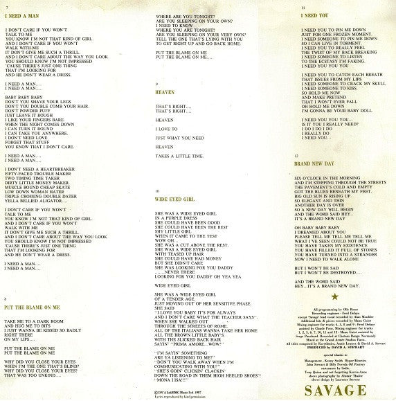 Release date : 7 December 1987 On Insert: Recorded at Chateau Dangu Normandy. Mixed at the Grand Armée Studios Paris. On Sleeve: Manufactured for and distributed by Starcall Records Pty. Limited in Australasia. Made under licence. On Spine: **EURYTHMICSAVAGE** Made in Australia On Labels: ℗RCA (UK) Ltd 1987 published by BMG Music Ltd Man. for & Dist. by Starcall Records Pty. Ltd. in Australasia. Made under licence. TM(S) (R) Marca (S) Registrada used by authority of the owner.