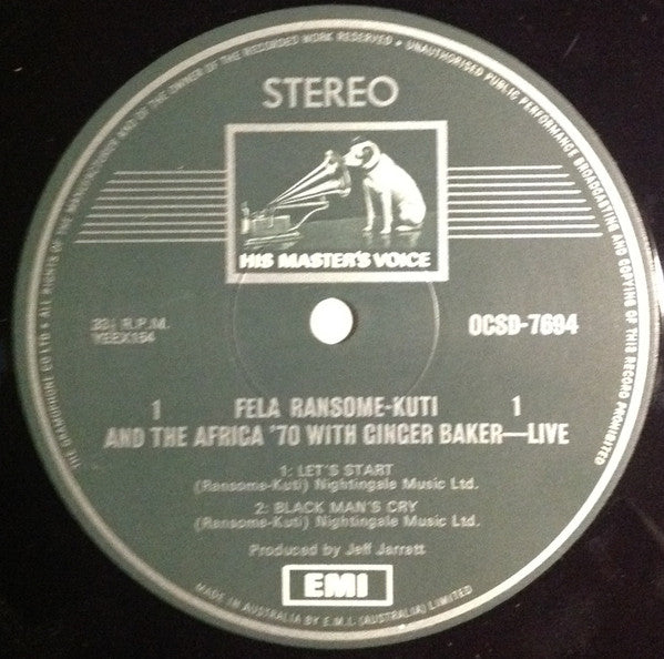 Back cover: "Thanks to Atlantic Records for allowing Ginger Baker to appear on this record" E.M.I (Australia) Limited (INCORPORATED IN N.S.W) 33 1/3 R.P.M Made and Printed in Australia