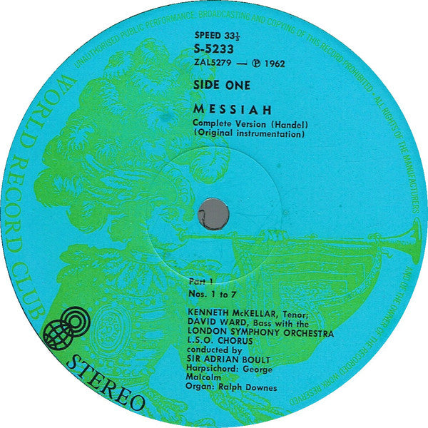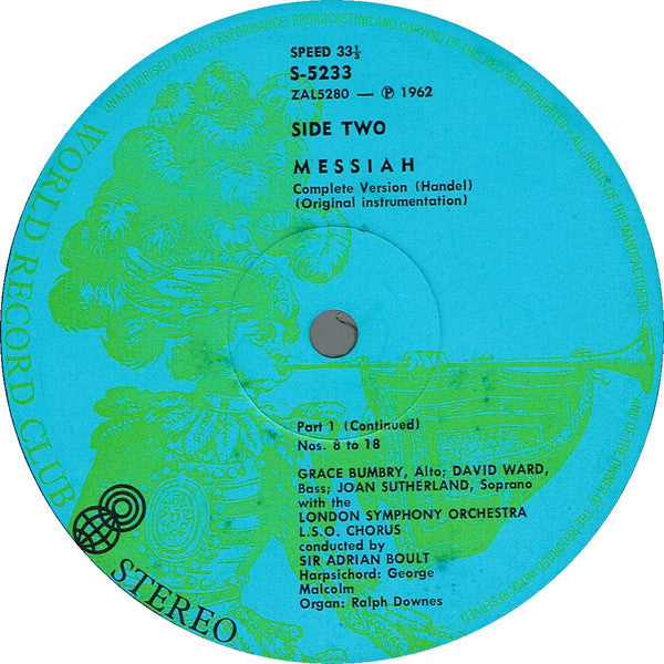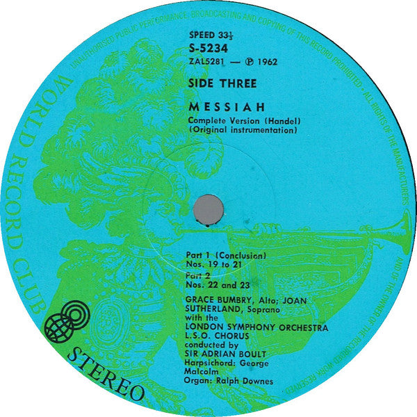 Original 1741 version. Australian WRC 1st pressing, sourced from original stampers and featuring unique sleeve art. Sides 4 and 6 are unbanded. Issued with 8-page booklet featuring liner notes, artist profiles and photos, and the libretto (p2 is blank). No. 11 is missing from the section numbers in the libretto, but has been included here as it appears on the vinyl. "℗1962" on labels. The labels feature squat/square headers, with all text in bold non-italics - the late 1972 style. Full 365 Camberwell address with postcode - the second WRC album to feature this (S/5229 was the first). The box has a purple cover, with gold lining inside. The first pressing is the only edition with gold lining inside the box. World Record Club: Registered Office - 365 Camberwell Road, Hartwell, Victoria, 3124. Issued several times by World Record Club: 1st: Purple cover, gold inner lining, S- numbers on labels 2nd: Purple cover, white inner lining, S- numbers on labels 147289953rd: Apricot cover, white inner lining, R- numbers on labels, 147290064th: Light blue cover, white inner lining, R- numbers on labels 147290285th: Olive green cover, white inner lining, R- numbers on labels, libretto with thinner paper 72445746th: Brighter green cover, raw inner lining, R- numbers on labels, libretto with even thinner paper 147290617th: Orange-pink cover, raw inner lining, R- numbers on labels, same quality libretto as 6th