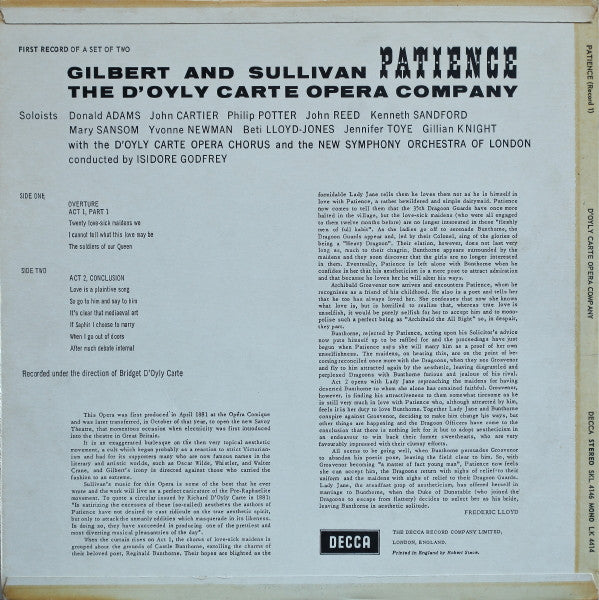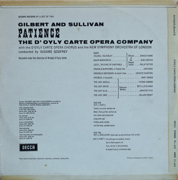 Gilbert & Sullivan, The D'Oyly Carte Opera Company Orchestra, Isidore Godfrey - Patience (With Complete Dialogue) - 2xLP, Album - Near Mint (NM or M-)