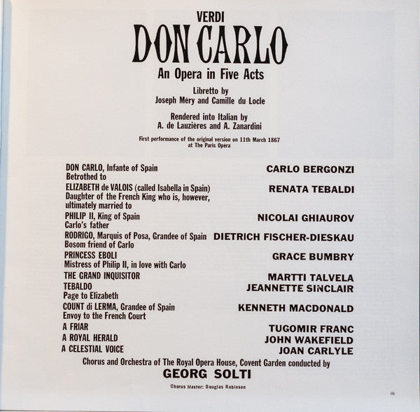 Giuseppe Verdi, Nicolai Ghiaurov · Carlo Bergonzi · Grace Bumbry · Renata Tebaldi · Dietrich Fischer-Dieskau, Chorus Of The Royal Opera House, Covent Garden & Orchestra Of The Royal Opera House, Covent Garden, Georg Solti - Don Carlo - 4xLP, Album, RE
