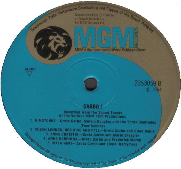 Sound clips from nine of Greta Garbo's films. Manufactured and distributed by Polydor Records, Ltd. for MGM Records Ltd.