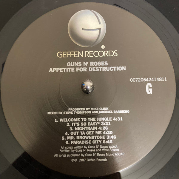 180 gram black vinyl. Standard single-pocket cover sleeve, "Parental Advisory Explicit Content" warning badge incorporated into front cover artwork. Includes a printed inner sleeve with artwork, lyrics & credits. The tracks durations are featured on release tracklist on vinyl labels. [Inner sleeve All songs written, arranged and performed by Guns N' Roses except “It's So Easy” co-written with West Arkeen and “Anything Goes” with Chris Weber Recorded at: Rumbo Studios, Canoga Park, CA. Take One Studio, Burbank, CA. Can Am Studio, Tarzana, CA Mixed at: Media Sound, NYC Album and cassette originally mastered by George Marino at Sterling Sound, NYC CD mastered by Barry Diament, NYC Tattoos by Robert Benedetti at Sunset Strip Tattoo All Songs © 1987 Guns N' Roses Music ASCAP. Lyrics Reprinted by Permission. All Rights Reserved. © 1987 Geffen Records. Made in the EU. [Back cover Career affairs: Stravinski Brothers/Alan Niven 2101 Vanderbilt Lane, Unit 3 Redondo Beach, CA 90278 ℗© 1987 Geffen Records 2220 Colorado Avenue, Santa Monica, CA 90404 U.S.A. Distributed by Universal Music Distribution. All rights reserved. Made in the EU. Universal International Music BV. Gerrit van der Veenlaan 4, 3743 DN, Baarn, Netherlands. [Sticker on shrink wrap back Made in Czech Republic [Vinyl labels All songs published by Guns N' Roses Music ASCAP ℗© 1987 Geffen Records