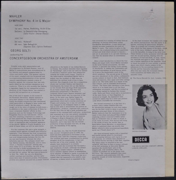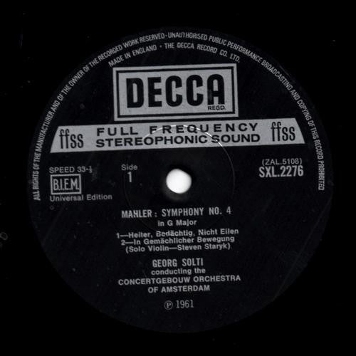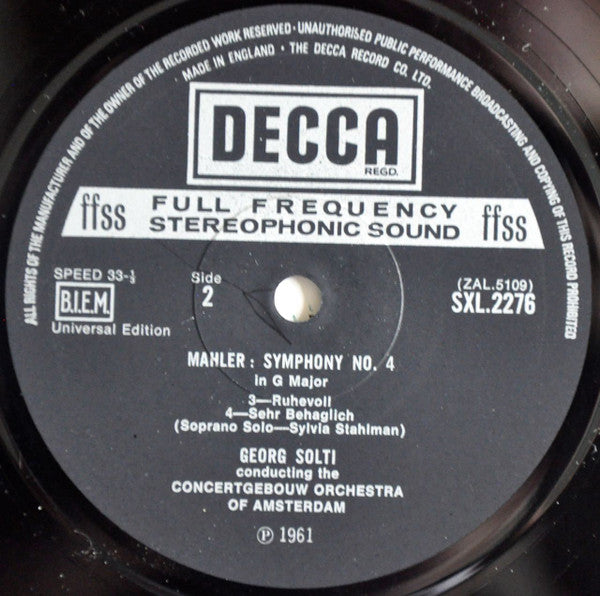LABELS: - "B.I.E.M." in a box on both sides - "Universal Edition" below BIEM box on both sides - ℗ 1961 at the bottom of label SLEEVE: - Front laminated - No flipbacks - Boxed Decca logo on front and back - "© The Decca Record Company Limited, London, 1961." - Sleeve "Printed in England" - Unsigned sleeve notes in English on back CATALOG NUMBERS: - SXL 2276 on sleeve - SXL.2276 on labels OTHER INFORMATION: - Recorded 20 - 21 February 1961 in the Concertgebouw, Amsterdam - This was the first issue in Georg Solti's Mahler cycle for Decca which continued until 1971.