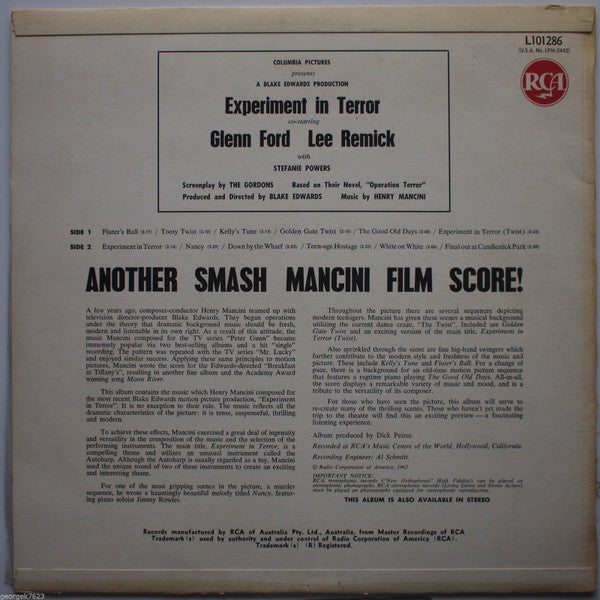Henry Mancini - Experiment In Terror (Music From The Motion Picture) - LP, Album, Mono - Very Good (VG)