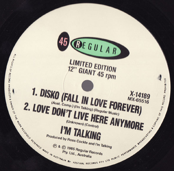 Side B1: Songwriter Listed As "Unknown". Recorded At A.A.V. Melbourne, May 1985. ℗ & © 1985 Regular Records Pty. Ltd., Australia Limited Edition 12" Giant 45 RPM.