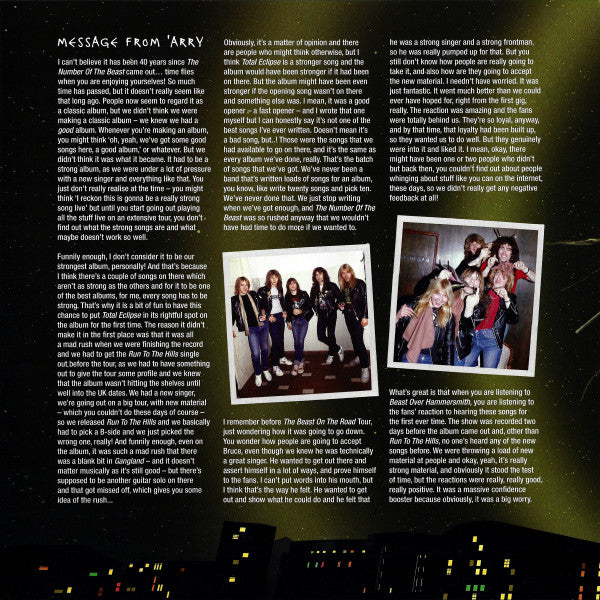40th Anniversary Edition. Triple heavyweight vinyl, trifold cover with printed inner sleeve. Runouts are etched. LP 1 with alternative track listing compared to the original LP. Total Eclipse replaces Gangland. LP 2 & 3 includes the March 1982 live concert at London's Hammersmith Odeon as part of the 'Beast On The Road World Tour' as an official vinyl release for the first time. Recorded just a few days before the release of The Number Of The Beast album. [On hype sticker: The Number Of The Beast: Original ℗ 1982 Remaster ℗ 2015 Beast Over Hammersmith: All Tracks ℗ 2002 ℗ 2022 [... © 2022 Iron Maiden LLP [... Made in Italy. [On inner sleeve LP 1: [... All tracks published by BMG Rights Management (UK) Ltd. [... Original ℗ 1982. Remaster ℗ 2015 except Total Eclipse Remaster ℗ 2022. Iron Maiden LLP under exclusive licence to Parlophone Records Ltd, a Warner Music Group company. © 2022 Iron Maiden LLP [On inner sleeve LP 2: [... All tracks published by BMG Rights Management (UK) Ltd. [... ℗ 2002 Iron Maiden LLP under exclusive licence to Parlophone Records Ltd, a Warner Music Group company. © 2022 Iron Maiden LLP.