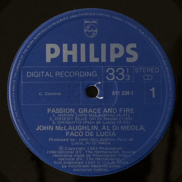 John McLaughlin - Al Di Meola - Paco De Lucía - Passion, Grace & Fire - LP, Album - Very Good Plus (VG+)