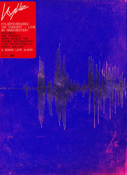 Housed in a shiny pink/silver embossed card slip-sleeve, inside which is a digipak with plain black front cover and a plain orange spine. A die cut pocket on the inside flap holds a 12 page glossy booklet. Aus / Nz edition has a red sticker on sleeve saying Kylie - Kyliefever2002 (In concert - Live in Manchester) Includes 2hr concert, 30 min behind the scenes documentary, Live projections & photo gallery & bonus Live Album 336045 K