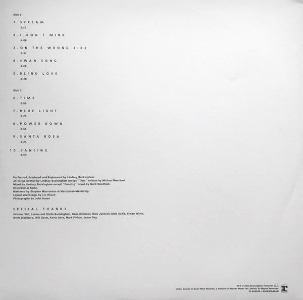 Recorded at home. ℗ & © 2021 Buckingham Records, LLC. Under license to East West Records, a division of Warner Music UK Limited. Manufactured for & Marketed by Rhino Entertainment Company, a Warner Music Group Company. Made in Czech Republic.