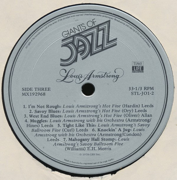 Comes with Booklet (50 pages), colour Image of Louis Armstrong, printed Notes on The Engineering and Inner Sleeves by Time Life Records. On labels: Made in Australia by a registered user of the trade marks. Inner Sleeves and Box has "Made in USA". Booklet has "Printed in USA".