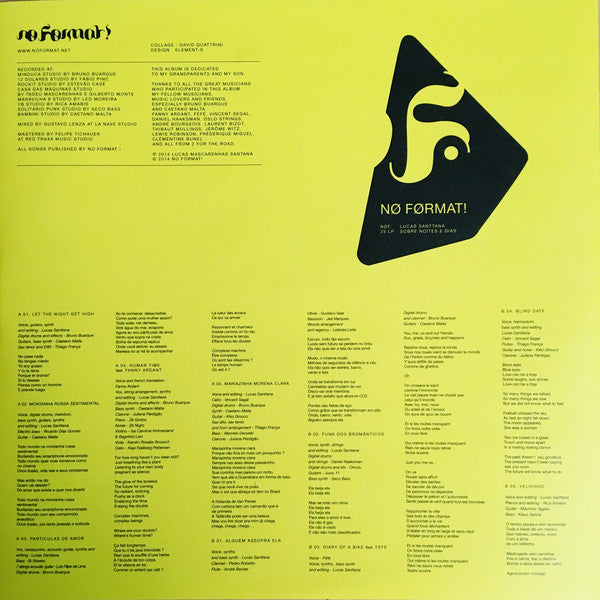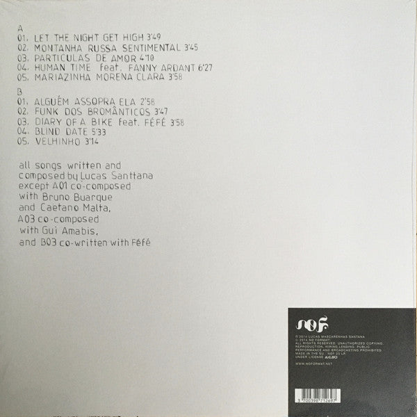 Inner cover include non-translated Portuguese (and also French) lyrics & credits. A link and code for downloading a digital copy is provided. © 2014 Lucas Mascarenhas Santtana ℗ 2014 Nø Format