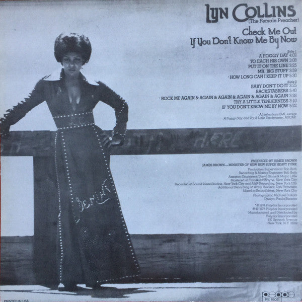 The pressing plant's identification numbers found in the runout grooves indicate that this version was likely initiatively pressed during 1996 or 1997. The sleeve has a semi gloss finish and when closely inspected the print quality of the sleeve is not very sharp and the colours are muted. Labels: *℗ 1974 Polydor Inc. ℗ © 1975 Polydor Inc. Back cover: Lyn Collins (The Female Preacher). *℗ 1974 Polydor Incorporated ℗ © 1975 Polydor Incorporated Manufactured And Distributed by Polydor Incorporated 810 Seventh Avenue New York, N.Y. 10019