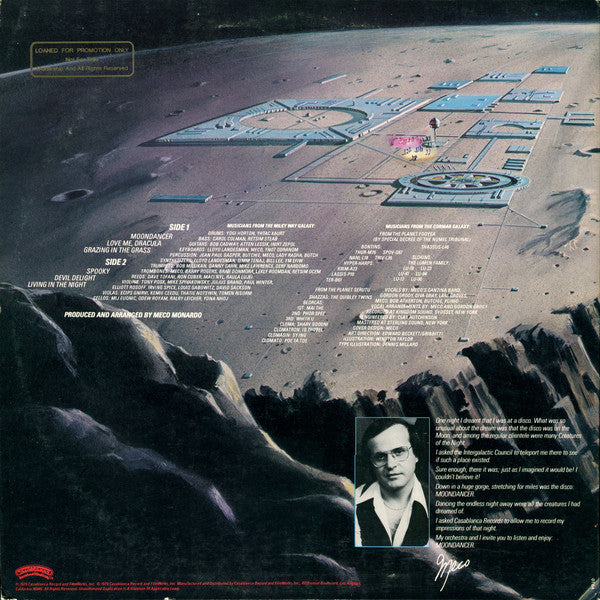 ℗ 1979 Casablanca Record and FilmWorks, Inc. © 1979 Casablanca Record and FilmWorks, Inc. Manufactured and distributed by Casablanca Record and FilmWorks, Inc. (From Rear Jacket Notes): One night I dreamt that I was at a disco. What was so unusual about the dream was that the disco was on the Moon, and among the regular clientele were many Creatures of the Night. I asked the Intergalactic Council to teleport me there to see if such a place existed. Sure enough, there it was; just I had imagined it to be! I couldn't believe it! Down in a huge gorge, stretching for miles was the disco MOONDANCER. Dancing the endless night away were all the creatures I had dreamed of. I asked Casablanca Records to allow me to record my impression of that night. My orchestra and I invite you to listen and enjoy MOONDANCER. ♏εζθ