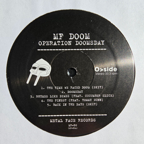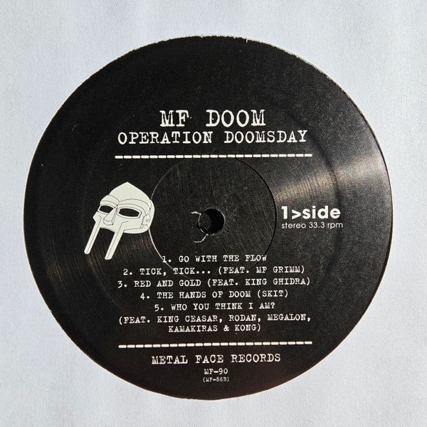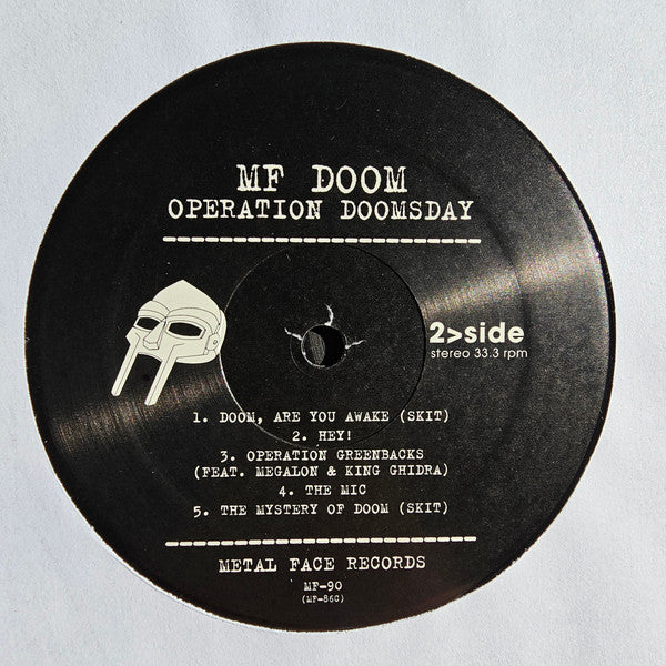 Similar to this release but came out two years later and the misprinted tracklisting on the labels has been corrected. The Runout Matrix is also slightly different as this version has no hyphen between "MF" and "90". HHV also named it differently on their webpage, but other than that both versions seem identical. "Operation: Doomsday Silver Cover Edition" released by German-based record retailer HHV (hhv.de) in March of 2023. Hype sticker reads: MF DOOM Operation Doomsday ------------------------ Remastered 2-LP Contains: All The Original Album Cuts ------------------------ Metal Face Records MF-90 8 29357 00901 2 (Barcode) No information on the album cover, no inserts, only a hype sticker and an embossed cover.