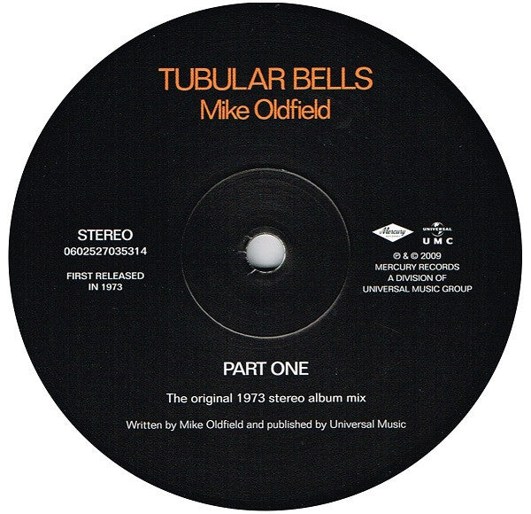 Issued with a printed inner sleeve and with a code to download the album in mp3 (128 kbps). First released in 1973. The original 1973 stereo album mix. Recorded at: The Manor/Autumn 1972 Spring 1973 ℗ & © 2009 Mercury Records A Division of Universal Music Group On inner sleeve: ℗ & © 2009 Mercury Records Limited under exclusive licence from Mike Oldfield Black Mercury / Universal labels with orange and white relief print. Tracks are listed as SIDE 1 and SIDE 2 on the cover, followed by the relevant instruments and guest musician lists. On this version the tracks are simply credited as PART ONE and PART TWO on the labels.