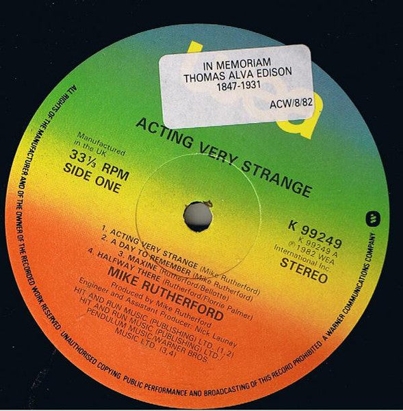Recorded mainly at the Farm, Surrey. Recorded at The Town House, London. Thanks to - Nick, Tony, Dale, Geoff, John Edwards & A.R. Cover idea - A.R. Stewart Copeland appears courtesy of A&M Records. Gary Barnacle appears courtesy of Epic Records. On back cover it states "All titles published by" and lists "Michael Rutherford Ltd." but does not on the label. Durations do not appear on this release. Timings via stopwatch.