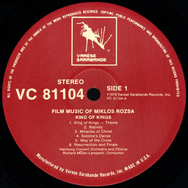 Recorded on 35mm tape, May 1962. Previously released as Widescreen Spectaculars, Stereo Fidelity SF-16400. Title on label: Film Music of Miklos Rozsa. Title on rear cover: Suites From the Epic Films. Mastered by Jack Hunt at Alshire International--1979. © 1979 Varèse Sarabande Records, Inc. Made in U.S.A.