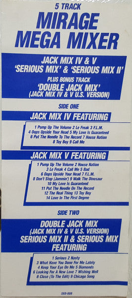 (C)(P) 1988 Debut Records UK "Jack Mix IV": 1) Pump Up The Volume; 2) Le Freak; 3) F.L.M.; 4) Oops Upside Your Head; 5) My Love Is Guaranteed; 6) Put The Needle To The Record; 7) House Nation; 8) Toy Boy; 9) Call Me "Jack Mix V": 1) Pump Up The Volume; 2) House Nation; 3) Le Freak; 4) Call Me; 5) Bad; 6) Oops Upside Your Head; 7) F.L.M.; 8) Don't Stop (Jammin'); 9) Walk The Dinosaur; 10) My Love Is Guaranteed; 11) Put The Needle To The Record; 12) The Real Thing; 13) Toy Boy; 14) Love In The First Degree "Serious Mix II": 1) Serious; 2) Nasty; 3) What Have You Done For Me Lately; 4) Keep Your Eye On Me; 5) Diamonds; 6) Looking For A New Love; 7) Wishing Well; 8) Close (To The Edit); 9) Chicago Song "Serious Mix": 1) Serious; 2) Keep Your Eye On Me; 3) What Have You Done For Me Lately; 4) Diamonds; 5) Looking For A New Love; 6) Chicago Song