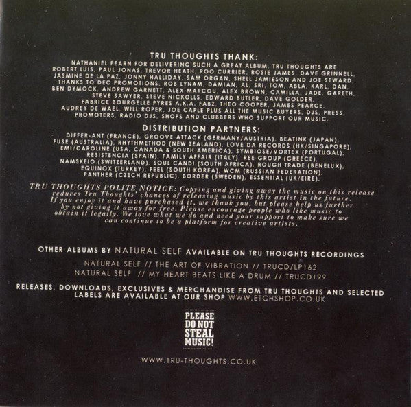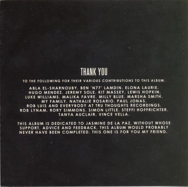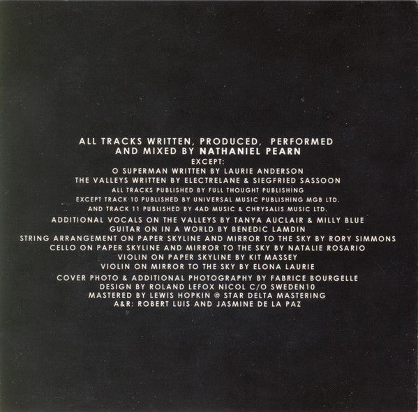 All tracks written, produced, performed and mixed by Nathaniel Pearn All tracks published by Full Thought Publishing Except track 10 published by Universal Music Publishing MGB Ltd. Except track 11 published by 4AD Music & Chrysalis Music Ltd. Cover photo & additional photography by Fabrice Bourgelle Design by Roland Lefox Nicol ℅ Sweden 10 Mastered by Lewis Hopkin @ Star Delta Mastering ℗ & © Tru Thoughts 2012