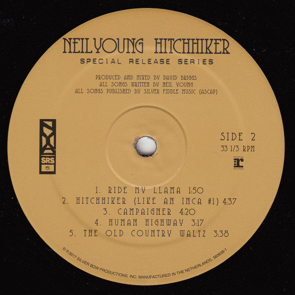 This version does not have "SOURCE Mastered from the original analog tapes" on labels. Copies with this text on labels are at [r=12602484 There is no indication anywhere on the release, but this is a mono recording. Issued with gatefold cover and 23"x28" poster with lyrics and credits. Hype sticker lower right on shrink: 'Unreleased 1976 Solo Album Produced by David Briggs 1-560639 (K1)' NYA - Special release series © ℗ 2017 Silver Bow Productions, Inc. Manufactured in the Netherlands (on labels). Manufactured in the EU (on back cover). Mastered at Grundman Mastering 1st cat# on spine and poster 2nd cat# on labels This release differs from [r=10816311, as it has the cat # of 9362-49126-1 on the spine. Runouts etched, exc. 19612 2A / 19612 2B, stamped