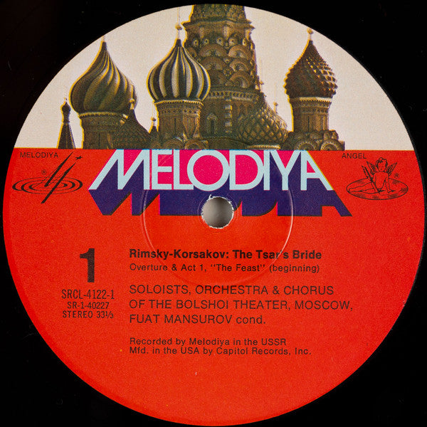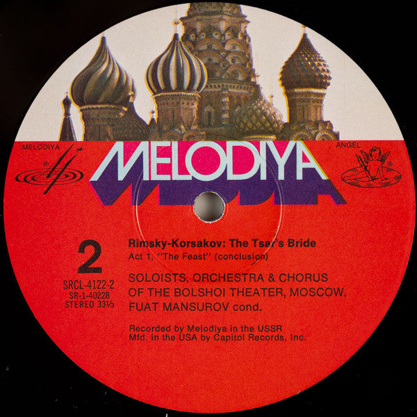 Third Label Design: Melodiya/Angel 1/3:Moscow 2/3:Red with black font Recorded by Melodiya in the USSR. Sung in Russian. Automatic sequence side coupling. Booklet (10 p.) includes libretto in English.