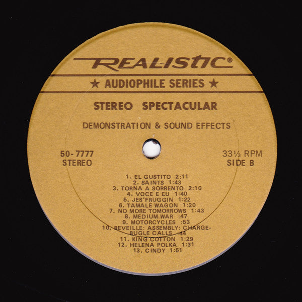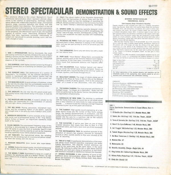 "Produced exclusively for Realistic by Audio Fidelity Records" "Distributed by Allied Radio Shack - Div. of Tandy Corp., Fort Worth, Texas 76107" "Printed in U.S.A. © Copyright 1971 by Audio Fidelity Records, a Division of Audiofidelity Enterprises, Inc." Partial liner notes: "The selections offered in this unique Stereophonic Sound Spectacular demonstration album represent ultimate attainments in the creation of spine-tingling, startingly realistic stereo effects with widest total frequency range, unsurpassed dynamic range, maximum definition and clarity, and with absolute freedom from distortion. This recording is a tour de force in precision audio engineering, but it is also a panoramic presentation of great entertainment, the bravura and majesty of the symphony, the effervescent spirit of jazz, the haunting mystery of oriental music. Astounding situational stereo effects have been ingeniously conceived, meticulously recorded and reproduced to provide stunning comic and dramatic changes of pace."