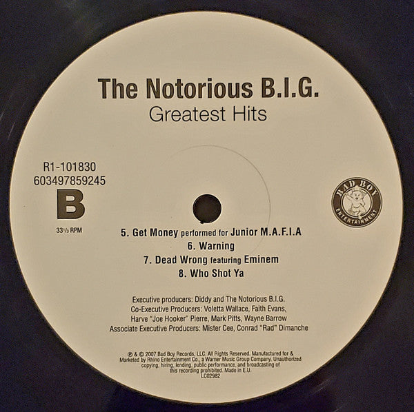 MPO 20, Denoted in matrix runouts (2020 release). No made in France sticker on back. Hype sticker similar to the 2018 releases. Dots in the hype sticker are silver metallic ink & text is in white ink with a black background. Parental advisory on bottom right of front cover. ℗ & © 2007 Bad Boy Records Llc. Burbank CA. Address on back credits. Made In Europe. Executive Producers: Diddy and The Notorious B.I.G. Co-Executive Producers: Volleta Wallace, Faith Evans, Harve "Joe Hooker" Pierre, Mark Pitts, Wayne Barrow Associate Executive Producers: Mister Cee, Conrad "Rad" Dimanche Labels are white soft luster paper with one pressing ring. Runouts are etched except for MPO logo with numeric digits. No download card. Comes with a double side color print slip sheet with tracks, images, notes, and credits.