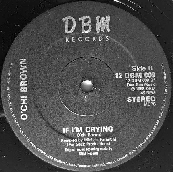 This variant without (Friends-Mix) on label A Other variant with (Friends-Mix) on label A [r2021916 Front sleeve: O'chi Brown Why can't we be Friends Rear sleeve: 12 DBM 009 (Cat) O'chi Brown, A: Why Can't We Be Friends B1: Why Can't We Be Friends (Dub Mix) B2: If I'm Crying Arranged and produced by Michael Farantini D B M Records © A D.B.M. Recording Distributed by P.R.T. Ltd, Mitcham, Surrey Labels: O'chi Brown D B M Records 12 DBM 009 (Cat) ℗ 1985 DBM 45 RPM Stereo MCPS Original sound recording made by BDM Records Label A: 12 DBM 009 A* Towwerbridge Music Why Can't We Be Friends (Bob Benham) Arranged & Produced by Michael Farantini Label B: 12 DBM 009 B* Dee Bee Music (B2) If I'm Crying (O'chi Brown) Remixed by Michael Farantiti (For Slick Production No duration on this edition