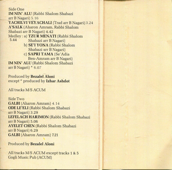 The languages in these songs are Hebrew, Aramaic and Arabic. All songs Public Domain except B1 Gogly Music Pub. Recorded at Triton Studios, Tel-Aviv August-Sept 1984. Mixed at Ruly Studios, Tel-Aviv November 1984. ℗ 1985 Hed-Arzi Ltd. © 1985 Ace Records Ltd. Made in West Germany