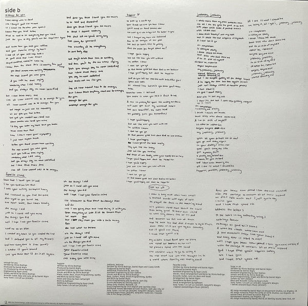 Housed in a gatefold jacket. Includes a custom inner sleeve with lyrics and credits. All track titles are stylized to be all lowercase. ℗© 2021 Olivia Rodrigo, under exclusive license to Geffen Records. Made In France. Universal International Music B. V. 'S-Gravelandseweg 80, 1217 EW Hilversum, Netherlands. Publishing: A1, A2, A3, A5, A6 - Sony Tunes / Liv Laf Luv (ASCAP). Sony/ATV Allegro / Daniel Leonard Nigro Music (ASCAP). A4 - Sony Tunes / Liv Laf Luv (ASCAP). Sony/ATV Tree Publishing / Taylor Swift Music (BMI). Sony/ATV Songs LLC / Ducky Donath Music (BMI). B1, B2 - Sony Tunes / Liv Laf Luv (ASCAP). B3 - Sony Tunes / Liv Laf Luv (ASCAP). Sony/ATV Allegro / Daniel Leonard Nigro Music (ASCAP). Sony/ATV Tunes LLC / Sounds Like A Pre Songs (ASCAP) deja vu: Drums recorded by Sterling Laws at Heavy Duty Studios, Burbank, CA jealousy, jealousy: Drums recorded by Sterling Laws at Heavy Duty Studios, Burbank, CA Additional vocals recorded at Funk Studios, Salt Lake City, UT All songs recorded [... at Amusement Studios, Los Angeles, CA All songs mixed [... at SOTA Studios, Los Angeles, CA except track B5 mixed [... at Amusement Studios, Los Angeles, CA All songs mastered [... at Sterling Sound, New York, NY Track A4 contains interpolations of the song "New Year’s Day" by Taylor Swift (Reputation, 2017). Track A5 This composition embodies portions of "Cruel Summer" written by Taylor Swift, Jack Antonoff and Annie Clark. Catalog number '00602438106417' printed on cover spine, back cover, printed inner sleeve and B-side label. Rectangular sticker on shrink: 'Includes the hit singles "Drivers License" and "Deja Vu" 00602438106417'. Runouts are hand-etched, except laser-etched MPO logo and MPO number sequence.