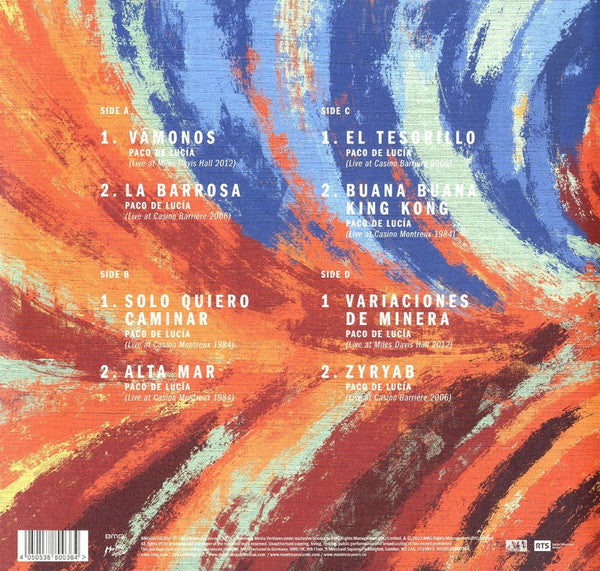 Sticker in front says: The finest performances from 3 legendary concerts Rare and previously unreleased material from Claude Nobs' private collection Mastered In superlative audio Double 180-gram heavyweight vinyl Exclusive liner notes by John McLaughlin A1, D1: Live At Miles Davis Hall 2012 A2, C1, D2: Live At Casino Barrière 2006 B1, B2, C2: Live At Casino Montreux 1984 Live archive release, a collection of Paco de Lucía's finest live performances at the Montreux Jazz Festival recorded between 1984 to 2012. Beautifully restored and remastered. Manufactured in Germany